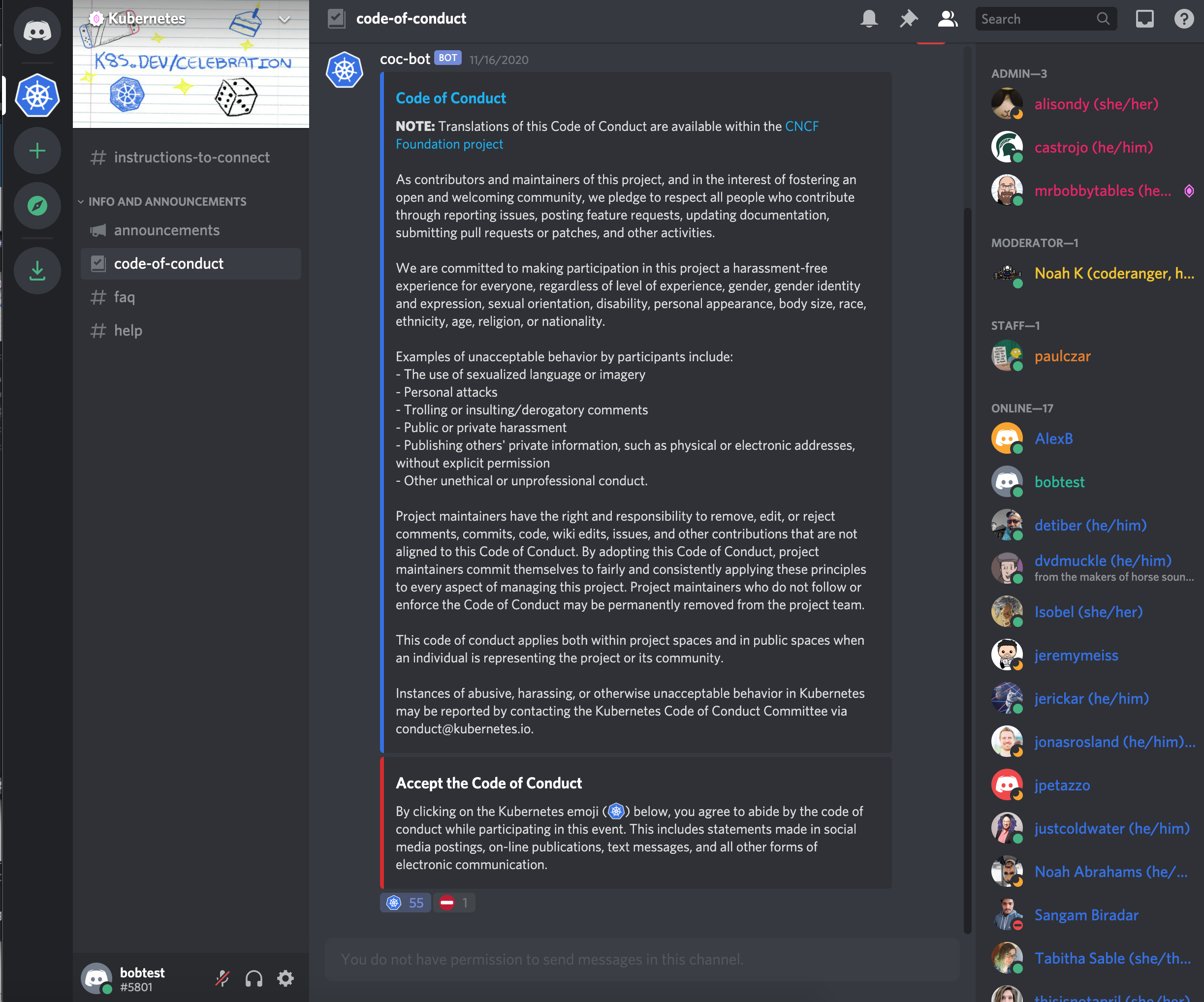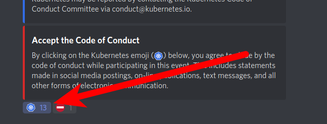 #code-of-conductchannel. There you will need to read and agree to the Code of Conduct by clicking on the Kubernetes emoji. This must be done before you can access any other channels within the server.